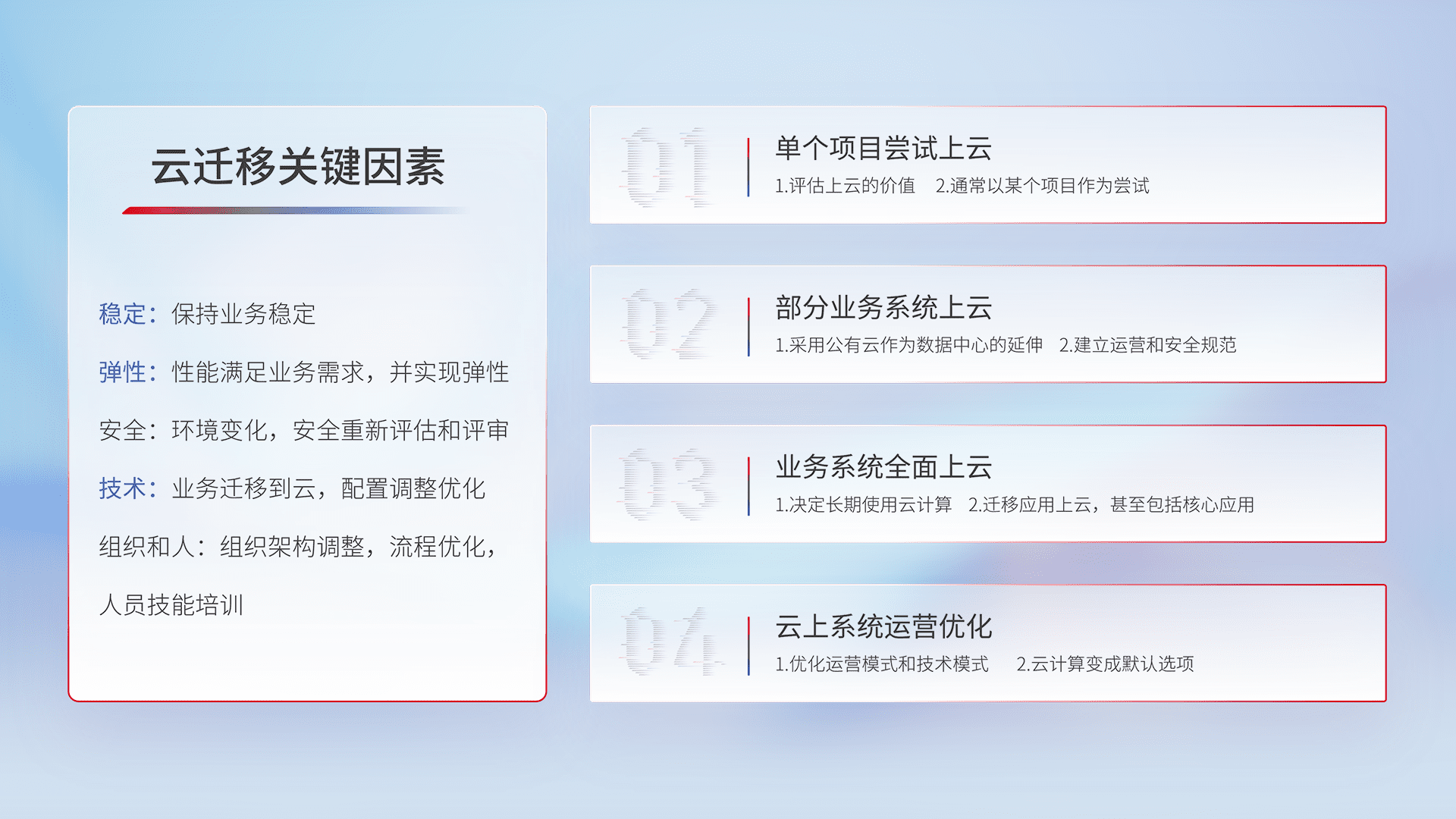 结合实际业务,,,从规划设计、、、、云平台选型、、云原生改造、、、、数据迁移、、、、集成交付,,迁移全过程为客户识别最佳上云路径,,,做好风险识别管理,,,,设计网络架构、、、、身份权限、、、安全审计合规、、、、操作审计、、、日志审计、、、监控告警策略、、多站点容灾设计等,,,,对云上基础设施进行整体规划,,,,提升IT治理水平,,以满足弹性、、高可用、、高性能的需求。。