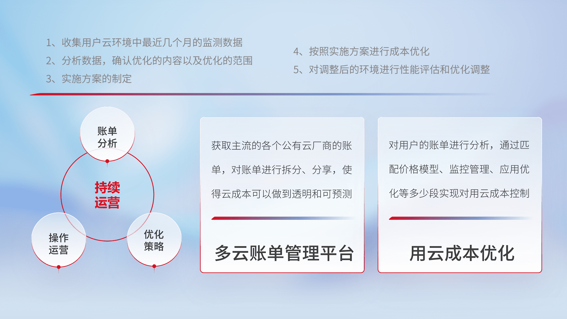 通过多云纳管,,,,以统一的资源数据模型把客户的云资源进行抽象和封装,,进而实现对多云资源的统一操作,,保障云资源管理的可靠性、、、、稳定性与可用性。。量身定制化运维内容,,,配置、、、开发运维、、补丁管理、、、备份、、、、监控、、、认证和访问管理、、、审计和日常巡检等,,保障在用云过程中的可靠度,,稳定度以及高可用率。。。